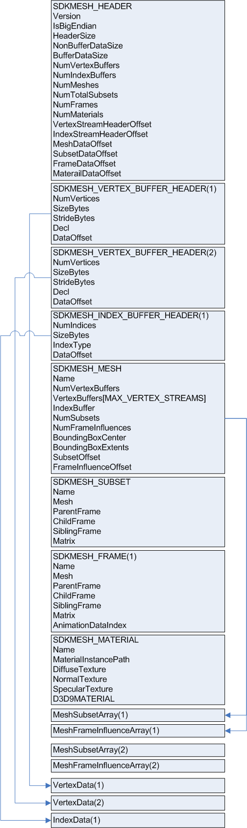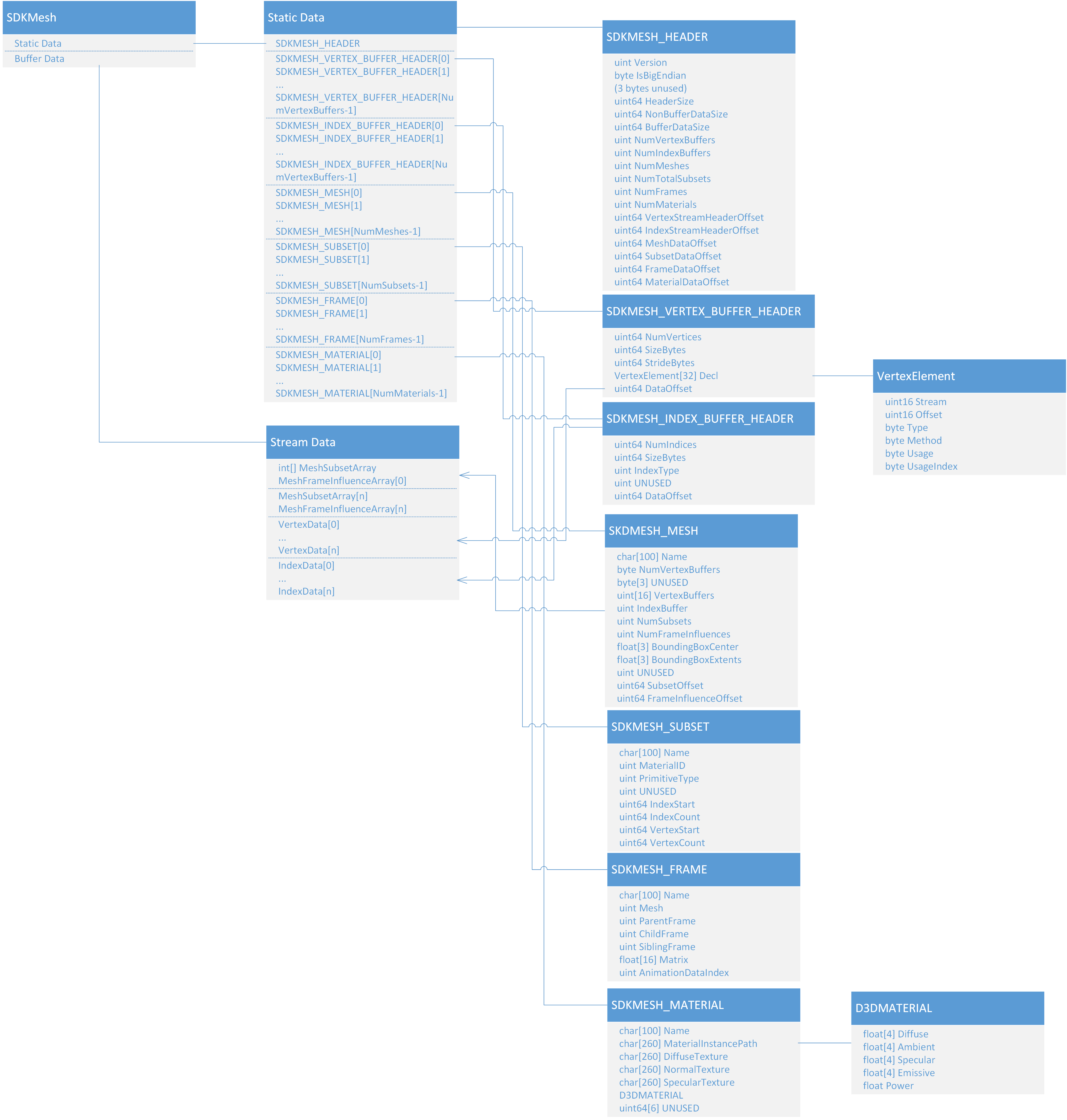 For the most part, I have consolidated the static header elements with the stream data that they refer to, for ease of parsing and use. Thus, the SdkMeshVertexBuffer elements contain both the data from the SDKMESH_VERTEX_BUFFER_HEADER portions of the file and the actual vertex data that the header describes.