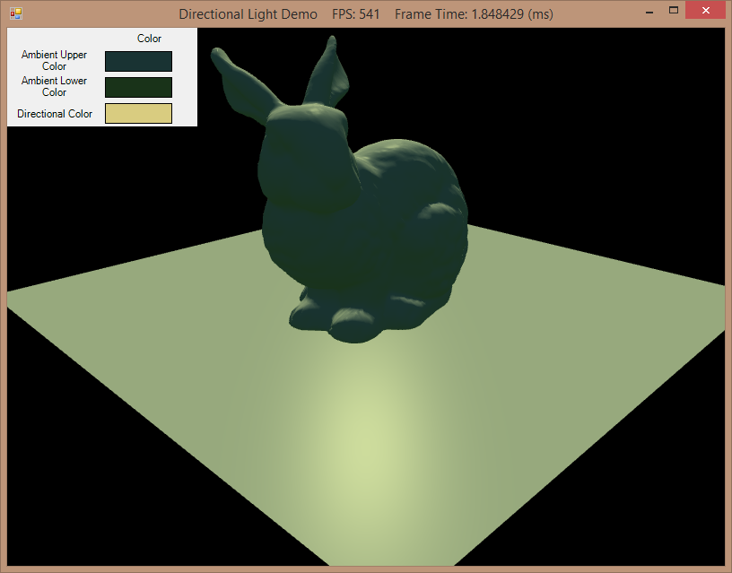 When I was working on converting the C++ sample code for the previous hemispherical ambient lighting example, I had a bunch of trouble getting the colors output by my code to match the original. I ended up getting this to work in that case by removing the step that converted the two ambient color values from gamma color-space to linear-space before passing them to the shader. However, when moving on to this directional lighting example, this no longer worked - summing the ambient light color with the directional light color in my pixel shader ended up doing some weird things, like the example below, where the lit surfaces appear blue-shifted.