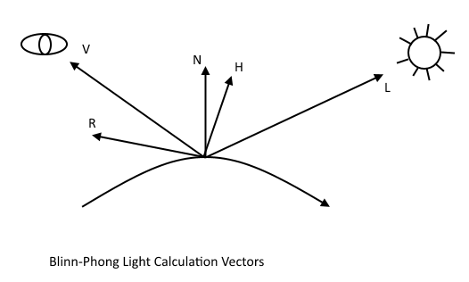 Our CalcDirectional() function calculates the direct lighting using the Blinn-Phong reflection model. This reflectance model uses the vectors shown below to calculate the diffuse and specular lighting components.