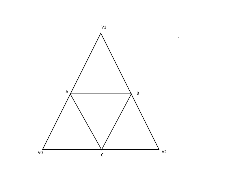 When we subdivide the triangles of the icosahedron, we will break the original triangle into 4 new triangles, by creating new vertices at the midpoints of the edges between the original vertices. The diagram below shows this subdivision, with the original vertices (V0, V1, V2) and the new midpoint vertices (A,B,C).