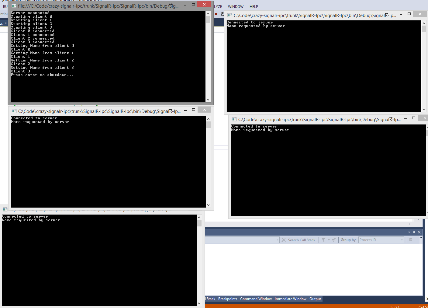 public class Server { private readonly List<Process> _clients; private readonly int _numClients; public Server(int numClients) { _numClients = numClients; _clients = new List<Process>(numClients); } public void Run() { // start SignalR listening using (WebApp.Start<Startup>("http://+:8080/")) { // connect to the hub with the special server SignalR connection var hubConnection = new HubConnection("http://localhost:8080/"); var proxy = hubConnection.CreateHubProxy("IpcHub"); proxy.On("ShutDown", () => Console.WriteLine("Shutdown order received")); hubConnection.Start().Wait(); // Spin up some client processes for (var i = 0; i < _numClients; i++) { var startInfo = new ProcessStartInfo(Assembly.GetExecutingAssembly().ManifestModule.Name) {Arguments = i.ToString()}; var p1 = new Process {StartInfo = startInfo}; Console.WriteLine("Starting client " + i); p1.Start(); _clients.Add(p1); } // wait a bit Thread.Sleep(5000); // Request the names from the client processes for (var i = 0; i < _numClients; i++) { Console.WriteLine("Getting Name from client " + i); Console.WriteLine(proxy.Invoke<string>("GetName", i).Result); } // Spin down the clients after the user presses enter Console.WriteLine("Press enter to shutdown..."); Console.ReadLine(); proxy.Invoke("ShutDown"); while (_clients.Any(p => !p.HasExited)) { Thread.Sleep(100); } Console.WriteLine("Press enter to exit..."); Console.ReadLine(); } } }