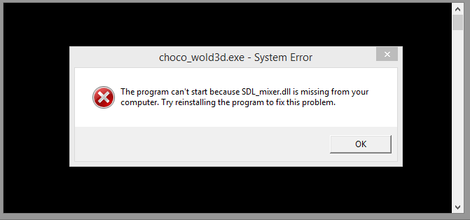 The SDL_mixer development libraries can be downloaded from https://www.libsdl.org/projects/SDL_mixer/release/SDL_mixer-devel-1.2.12-VC.zip . Once again, extract the downloaded zip file, and copy the SDL_mixer-1.2.12 folder into the /win32/vs2008/choco_wold3s directory. Build once more. The project should now build successfully. If you attempt to run the program, however, you will see the following error message:
