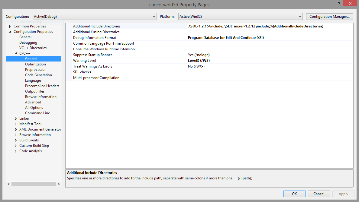 SDL is currently at version 2.0.3, after an extensive, long awaited rewrite. However, the 1.2.15 version which this project is built against is still available from their website. What we want here are the 1.2.15 development libraries. Download this archive, and copy the SDL-1.2.15 folder contained into the same directory as the choco_wold3s.vcxproj file (should be /win32/vs2008/choco_wold3s). Build again.